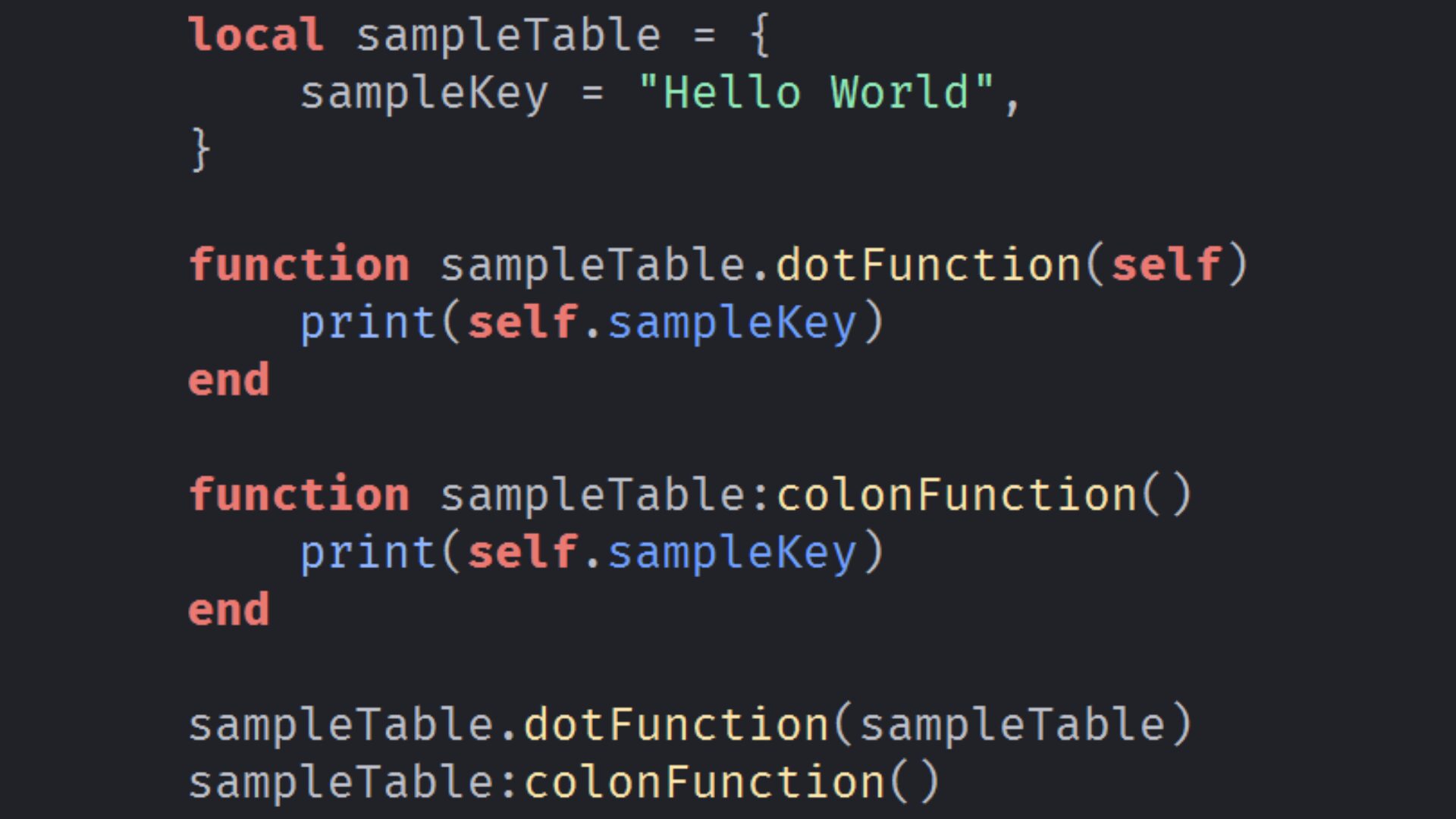 colonFunction() はコロンを使用して定義されており、sampleTable を self として自動的に受け取ります。