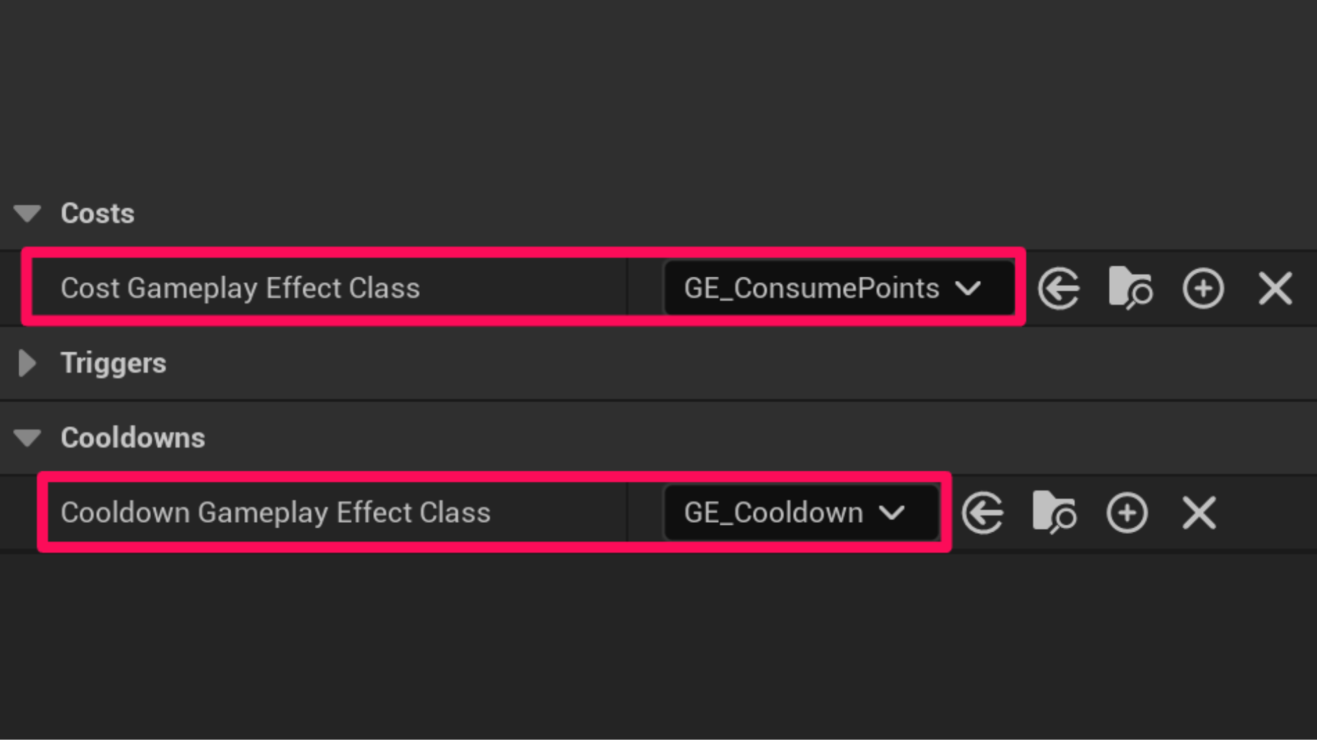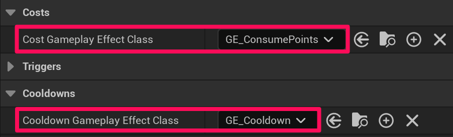また、「Costs > Cost Gameplay Effect Class」に GE_ConsumePoints を、「Cooldowns > Cooldown Gameplay Effect Class」に GE_Cooldown を設定します。