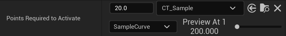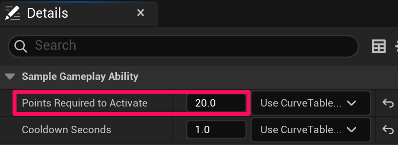 この記事の手順通りに進めると、アビリティの Class Defaults でその値を「PointsRequiredToActivate」として設定できるようになります。