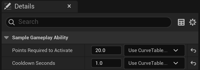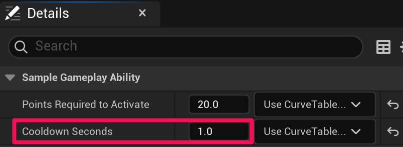「Class Defaults > Details > Sample Gameplay Ability」で PointsRequiredToActivate と CooldownSeconds の初期値を設定します。