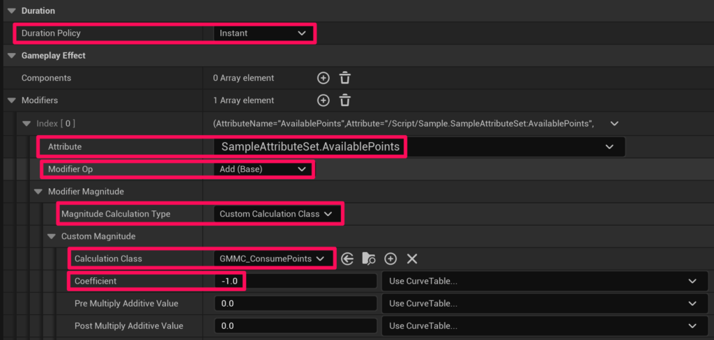 アビリティを発動するたびに AvailablePoints を減らしたり、クールダウンしたりする際は Gameplay Effect を使用するのですが、次はこの Gameplay Effect で使用する Gameplay Mod Magnitude Calculation(GMMC)を作成します。