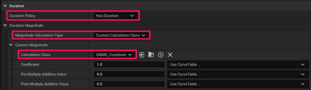 「Duration > Duration Magnitude > Magnitude Calculation Type」を「Custom Calculation Class」にして Calculation Class を「GMMC_Cooldown」にします。