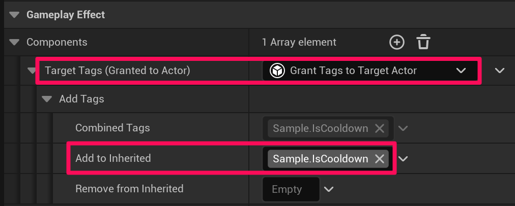 なので GE_Cooldown の「Gameplay Effect > Components」に「Grant Tags to Target Actor」を追加して、クールダウン用のタグを Add to Inherited に設定します。