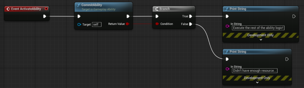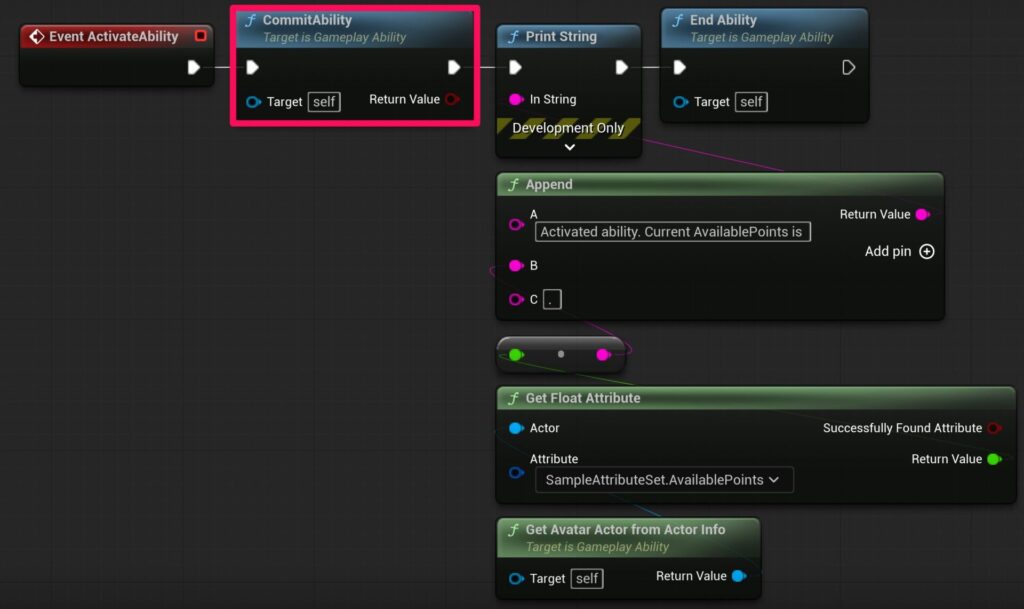 ActivateAbility() には、「Activated ability. Current AvailablePoints is {現在の AvailablePoints の値}.」というログを表示するという処理や、End Ability を呼び出すという処理の他に「Commit Ability」を呼び出すという処理も追加します。