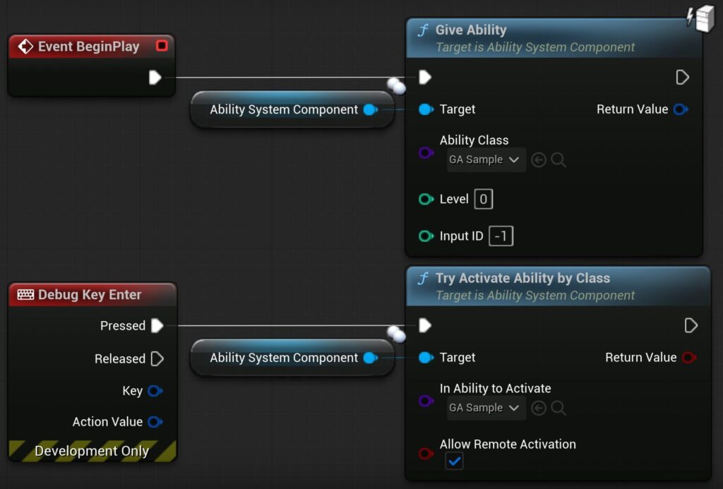 先ほど作成した GA_Sample をアクタに付与する処理を BeginPlay() に、GA_Sample を発動する処理を DebugKeyEnter() に追加します。