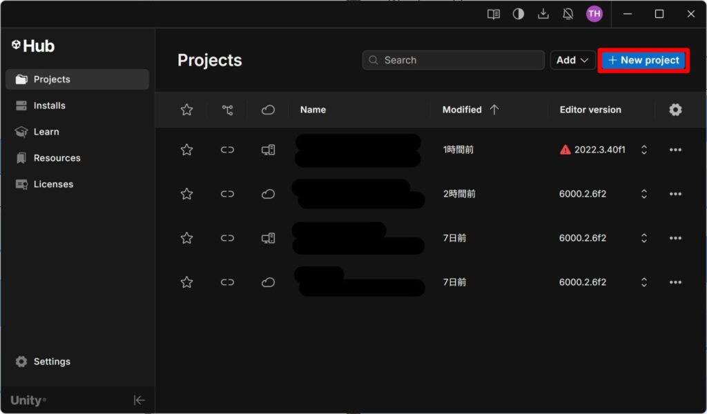 Unity Hub を開いて右上の「+ New project」を押します。