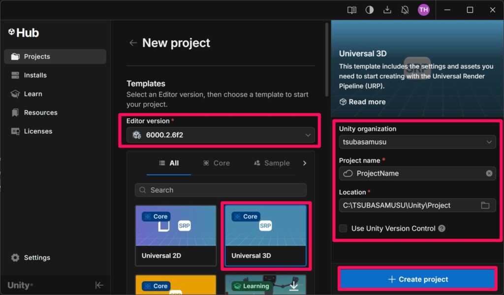 エディタのバージョンやテンプレート、プロジェクト名などを設定して右下の「+ Create project」を押します。