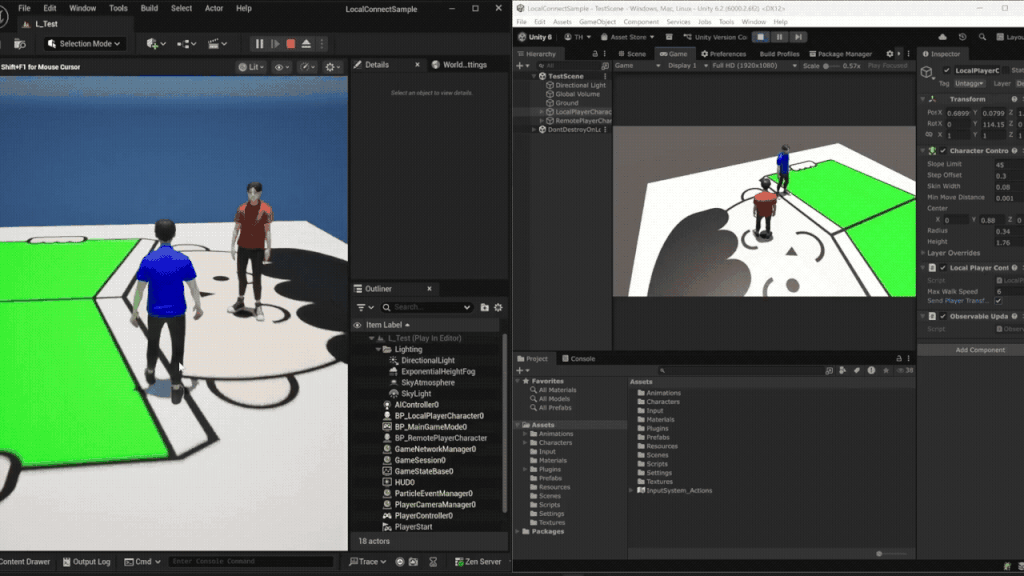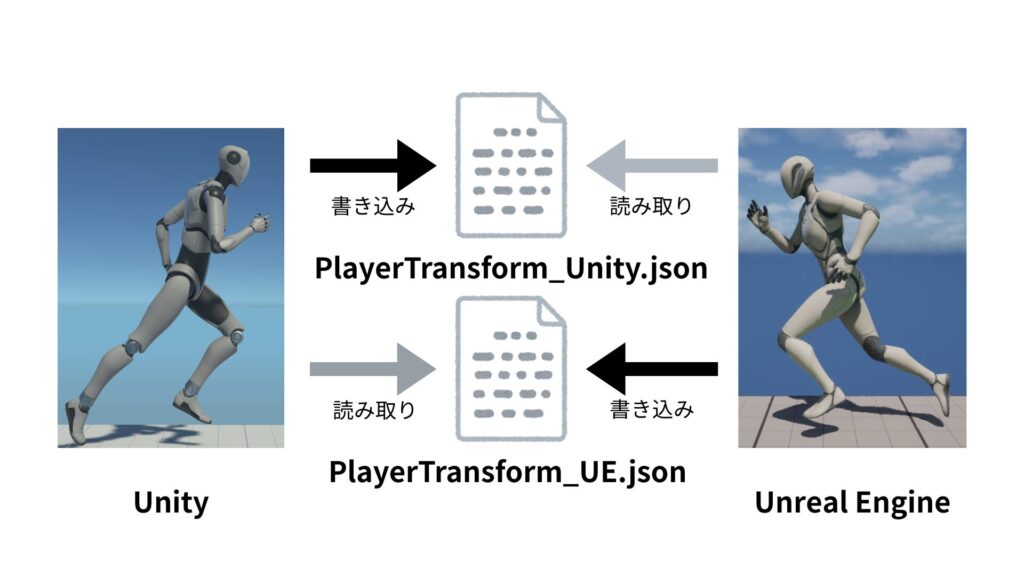 今年の4月頃に Unity エディタと Unreal エディタとのローカルマルチプレイについてツイートポストしたのですが、この時は各エディタがプレイヤーの座標と角度をローカルにある JSON ファイルに書き込んでそれを互いに読み取るという、このポストに書かれている通りの「ゴリ押し実装」をしていました。