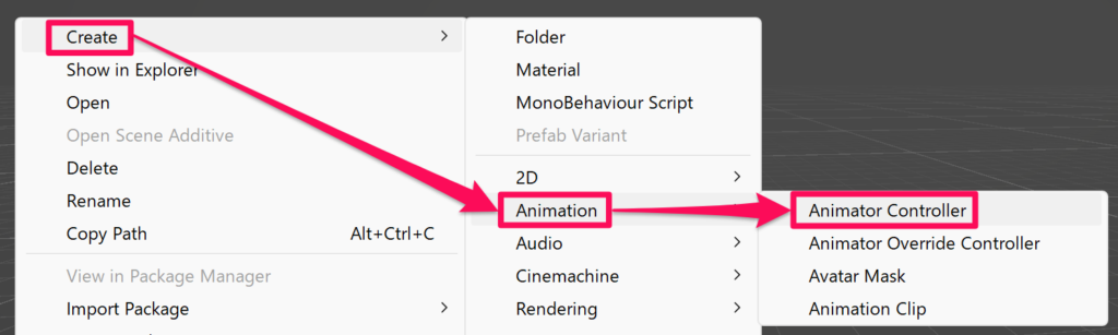次はアニメーションの制御に必要な Animator Controller を作成します。
