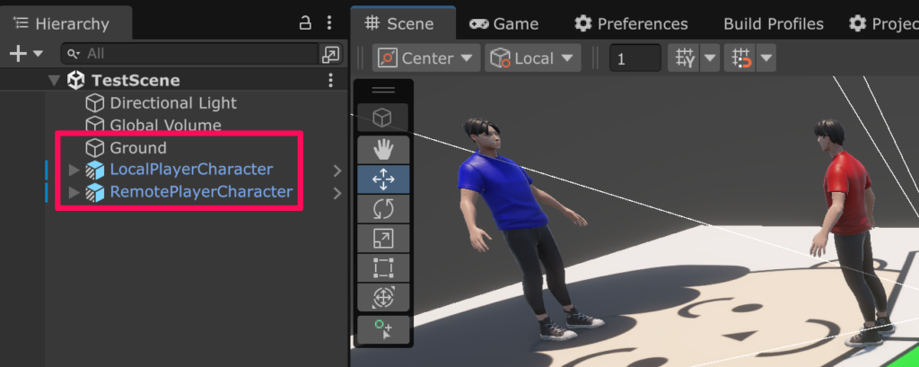 シーンに LocalPlayerCharacter や RemotePlayerCharacter、床の GameObject などを配置してゲームを実行します。