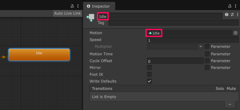 作成したステートを選択している状態でインスペクターからそのステートの名前を「Idle」などに変更し、待機用の Animation Clip を Motion にアサインします。
