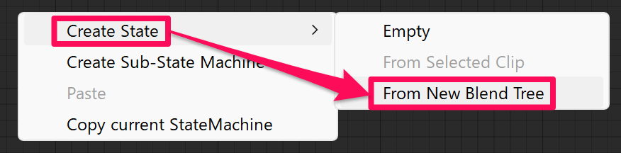 グラフ内で右クリックして「Create State > From New Blend Tree」を選択します。