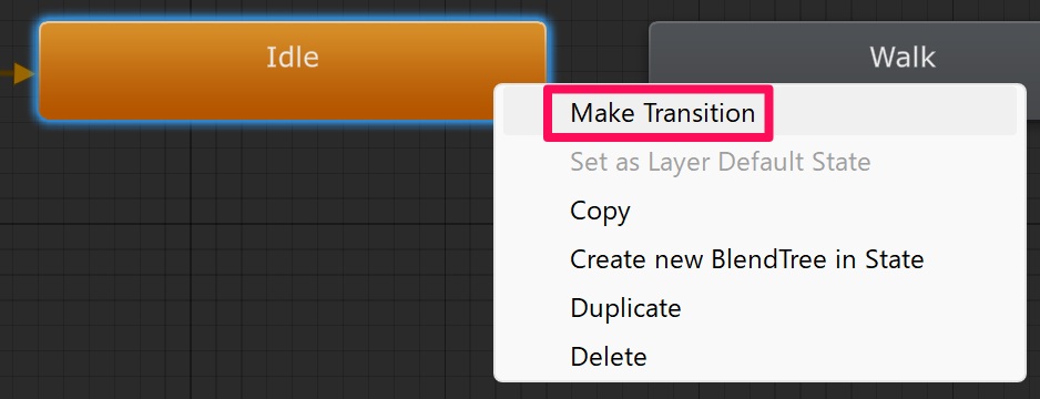 Idle ステートで右クリックして「Make Transition」を選択し、矢印を Walk ステートに接続します。