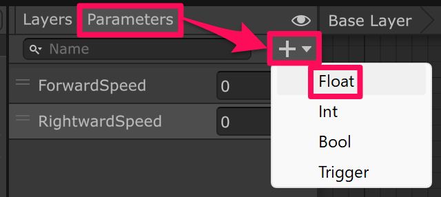 「Parameters > +▼」を押して「Float」を選択します。