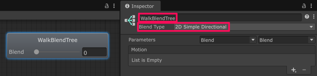 インスペクターでその Blend Tree の名前を「WalkBlendTree」などに変更して Blend Type を「2D Simple Direction」に変更します。