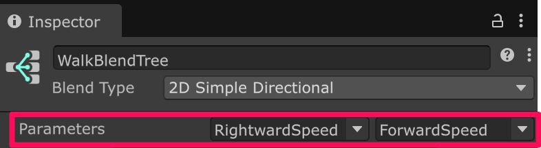 WalkBlendTree を選択している状態でインスペクターの Parameters を以下のように変更します。