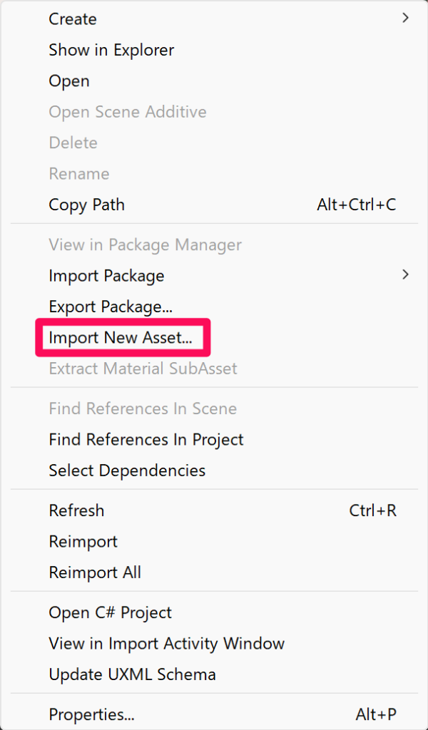 プロジェクトウィンドウで右クリックして「Import New Asset…」を選択します。
