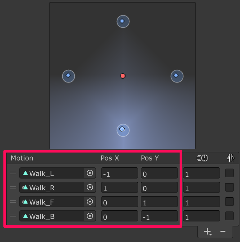 各要素に前後左右の歩行用の Animation Clip をアサインして Pos X と Pos Y の値は以下のようにします。