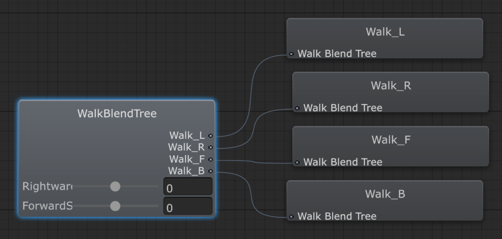 これらの設定を終えるとグラフ上での WalkBlendTree の見た目は下の画像のようになっているはずです。