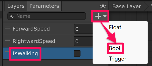 まずは Parameters で Bool 型の「IsWalking」というパラメータを追加します。