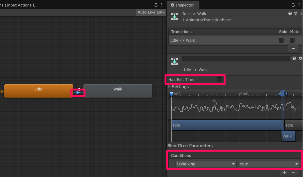 これで IsWalking が true のときに Idle から Walk に遷移するようになりました。