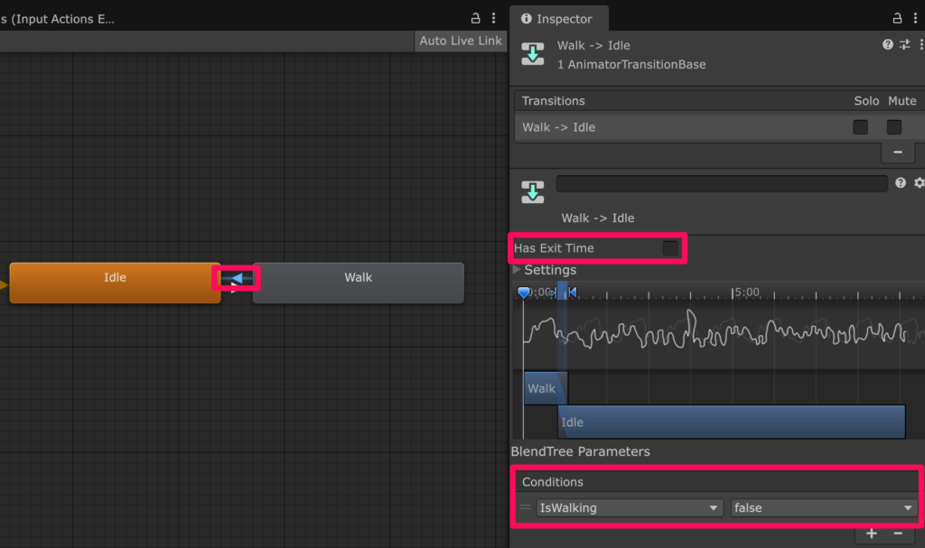 同様にして Walk から Idle に繋がっている矢印の設定も以下のように変更します。