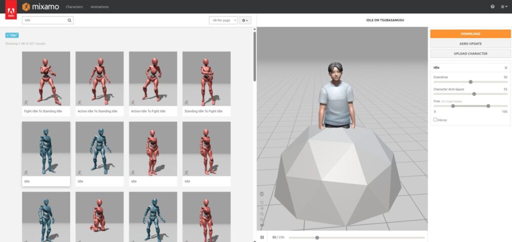 今回はそれらのアニメーションを Mixamo から FBX ファイルとしてダウンロードしました。