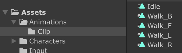 インポートした待機と歩行の Animation Clip のファイル名は以下のようにしました。