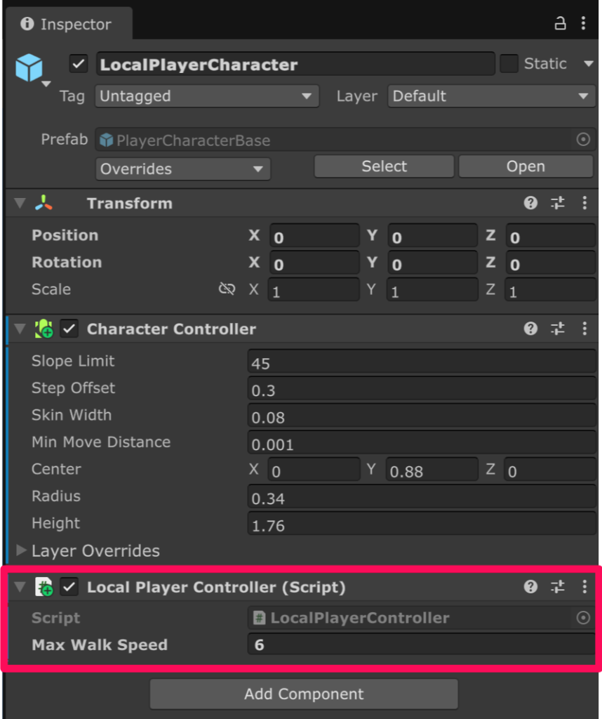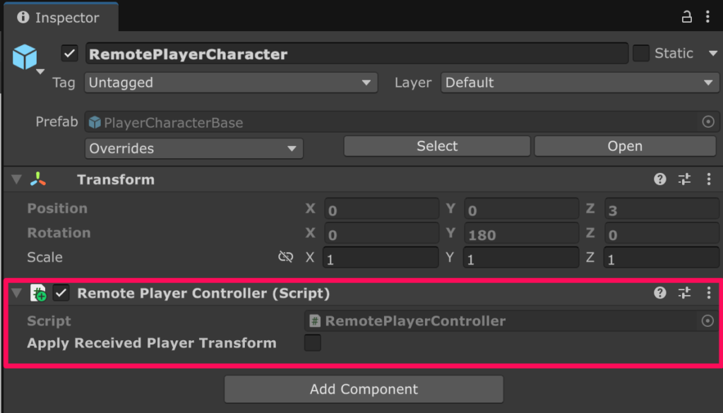 作成した RemotePlayerController をリモートプレイヤー用のプレハブのルートの GameObject にアタッチします。