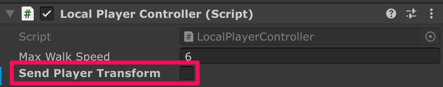 インスペクターで LocalPlayerController.sendPlayerTransform と RemotePlayerController.applyReceivedPlayerTransform にチェックを付けます。