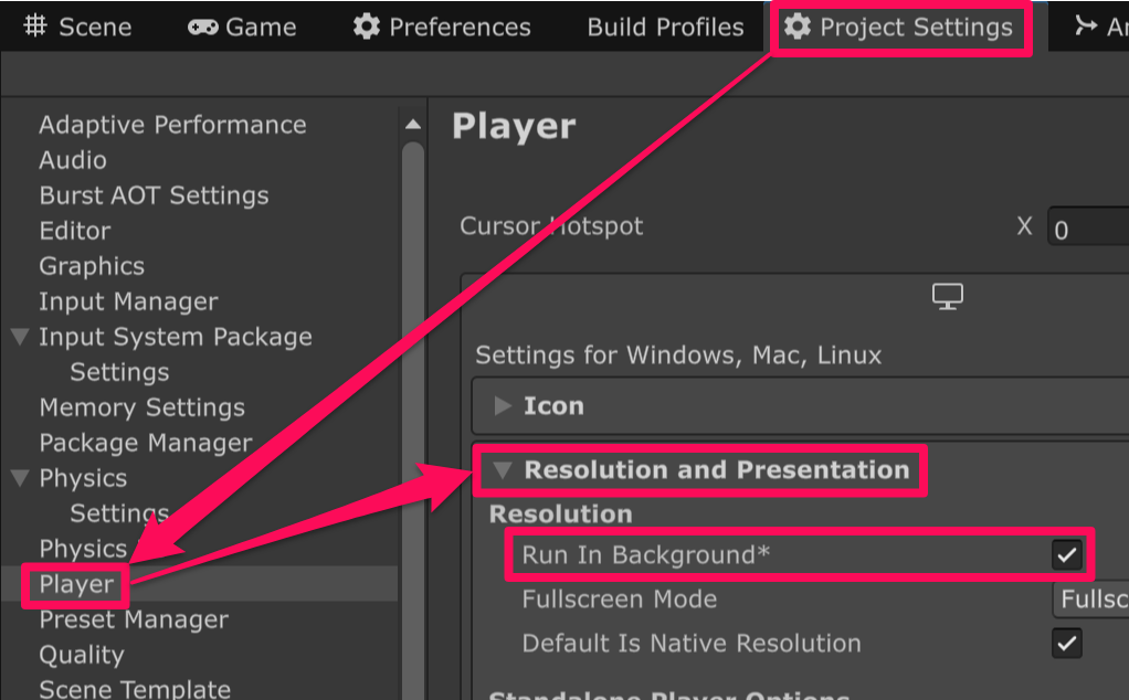 「Edit > Project Settings… > Player > Resolution and Presentation > Resolution > Run In Background」にチェックを付けます。