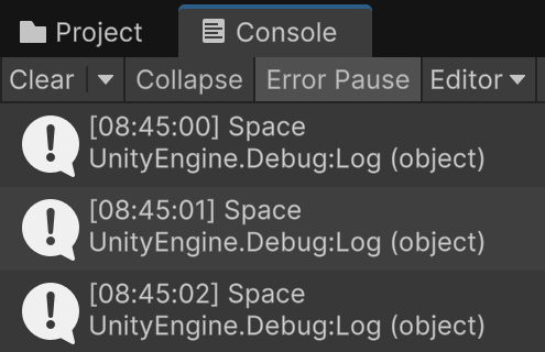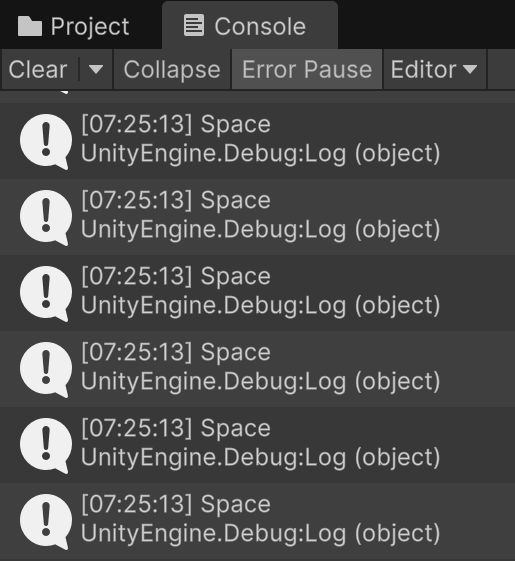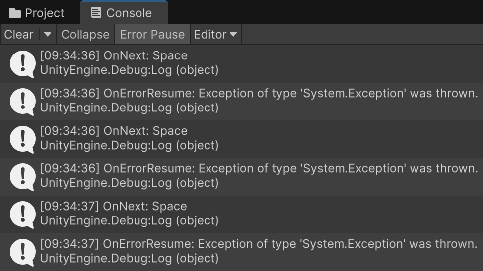 この状態でプレイしてスペースキーを押してみると「OnNext: Space」の後に「OnErrorResume: Exception of type ‘System.Exception’ was thrown.」と表示されますが、その後もスペースキーを何度も押せます。