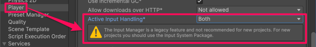 この場合は「Edit > Project Settings… > Player > Active Input Handling」を「Input Manager (Old)」か「Both」に変えるとエラーが発生しなくなりますが、「Both」の状態だと「The Input Manager is a legacy feature and not recommended for new projects. For new projects you should use the Input System Package.」という警告が表示されます。