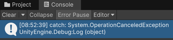 そして UniTask.WaitUntil() でも UniTask.Yield() でも CancellationToken を渡しているので Observer からキャンセルされると OperationCanceledException がスローされます。