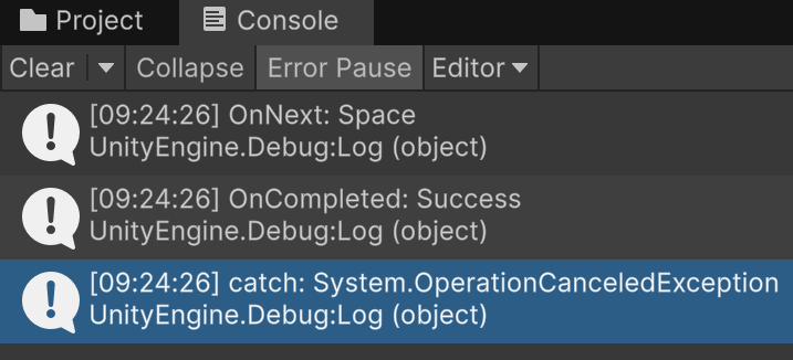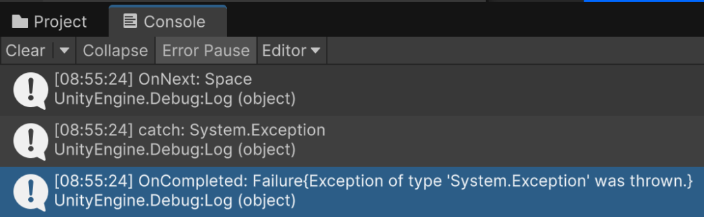 この状態でプレイしてスペースキーを押すと「OnNext: Space」と「catch: System.Exception」と表示されます。