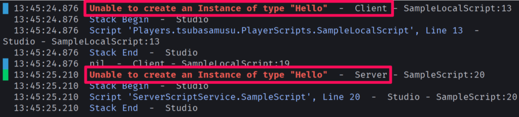 例えば以下のコードはサーバーから特定のクライアントに送信し、そのクライアントからの戻り値をサーバーが受け取るものですが、クライアントが RemoteFunction に登録する関数の中で Instance.new() に「Hello」という不正な文字列を渡しています。