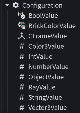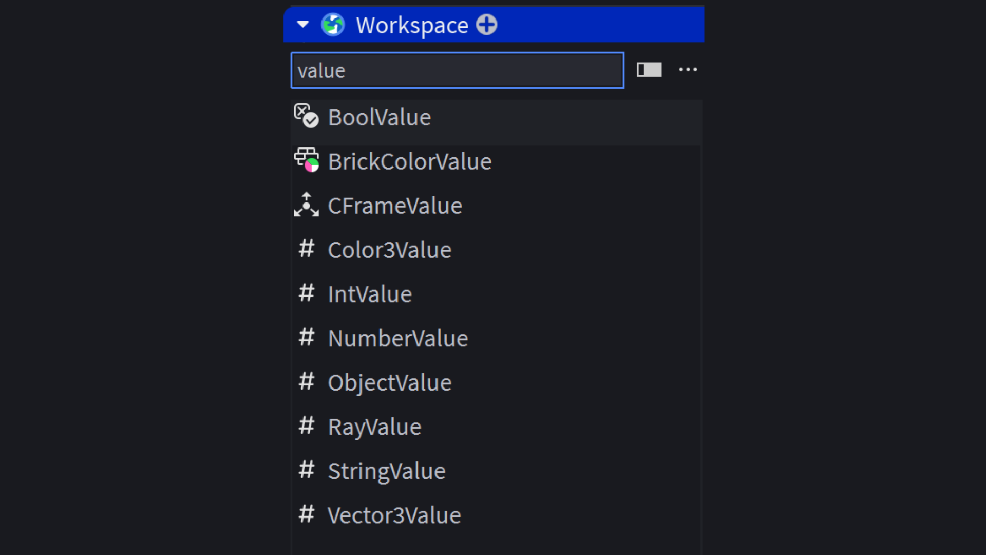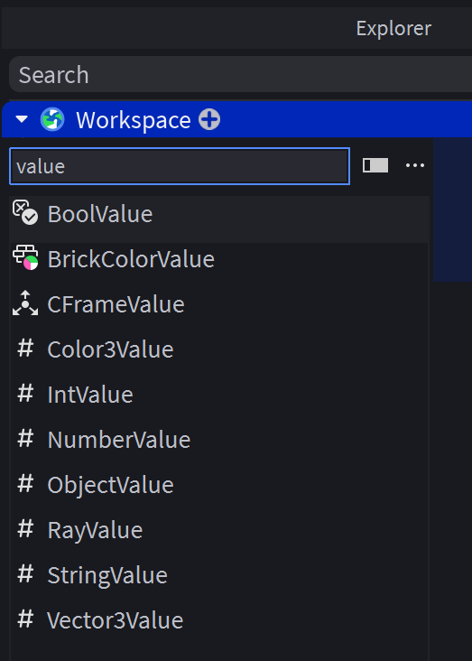 Explorer から Instance を手動で追加するときに「value」と検索すると BoolValue や BrickColorValue、CFrameValue などがヒットします。