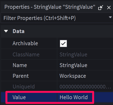 また、ValueObject やその Value は Roblox Studio から手動で編集する以外にもスクリプトから編集することもできます。
