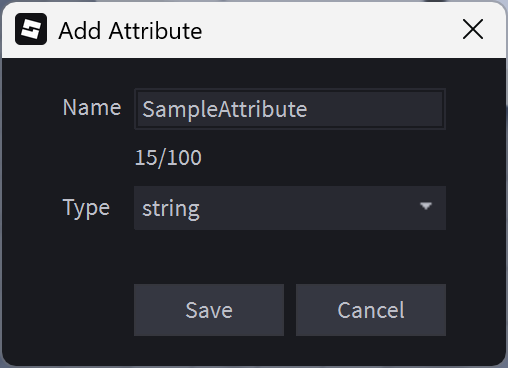 「Add Attribute」というウィンドウが表示されるので、追加したい Attribute の名前と型を設定して「Save」を押します。