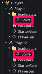 この公式ドキュメントを読むとわかるように Roblox 標準のリーダーボード機能では Folder をインスタンス化して「leaderstats」という名前に変更し、各 Player に親子付けした後、その中に StringValue や IntValue、NumberValue などの値型の ValueObject をインスタンス化して親子付けする必要があります。